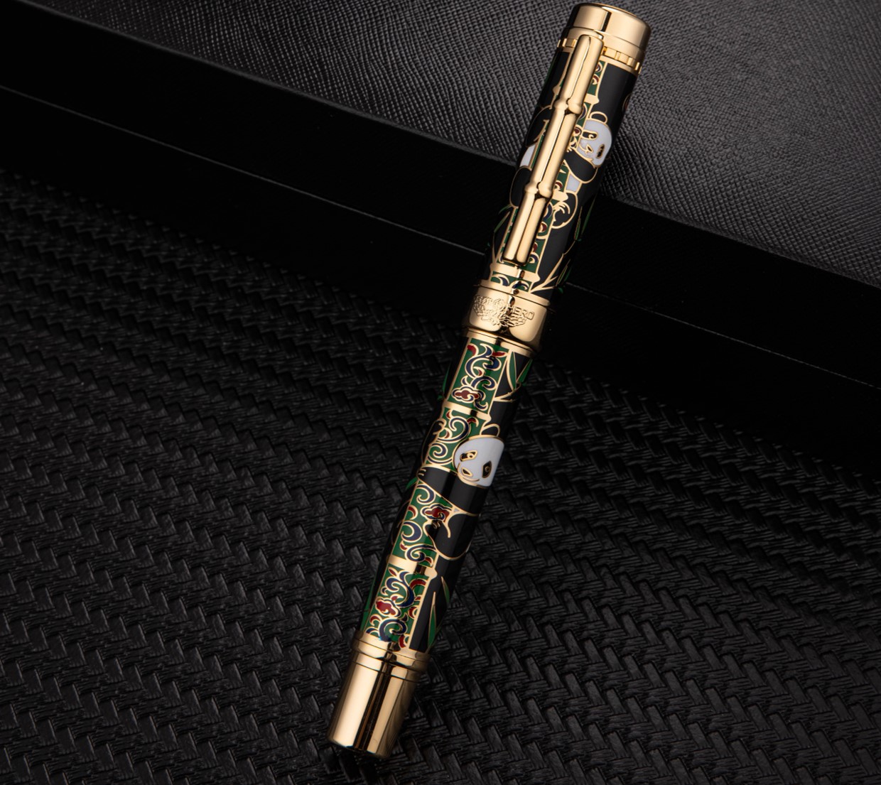 节节高升18K金笔(左二),主题为熊猫攀竹,笔夹为三节竹条,寓意连中三元,步步高升。